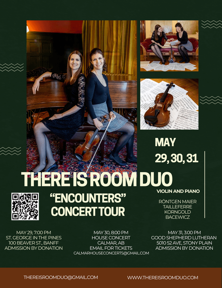 Welcome to the website of Canadian classical violin and piano duo There is Room. Our name is intentionally multi-faceted: we believe there is room on the classical concert stage for all kinds of new, under-represented, and non-traditional music, and that there is room in our audience for listeners from all walks of life. Have a look around! We're glad you're here.